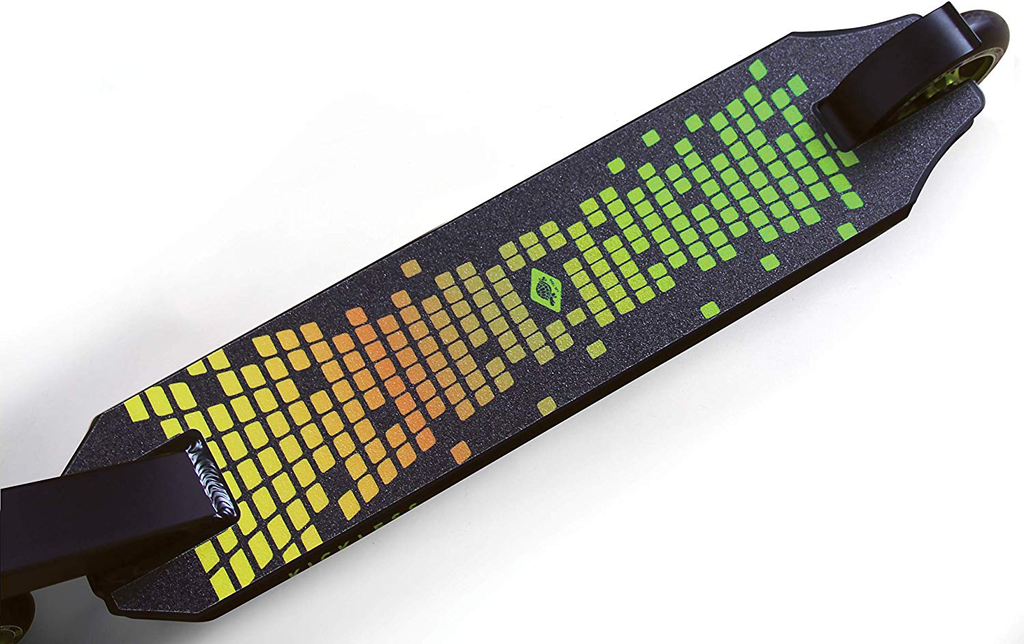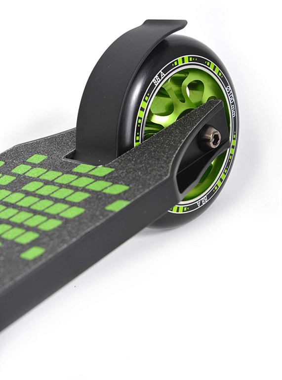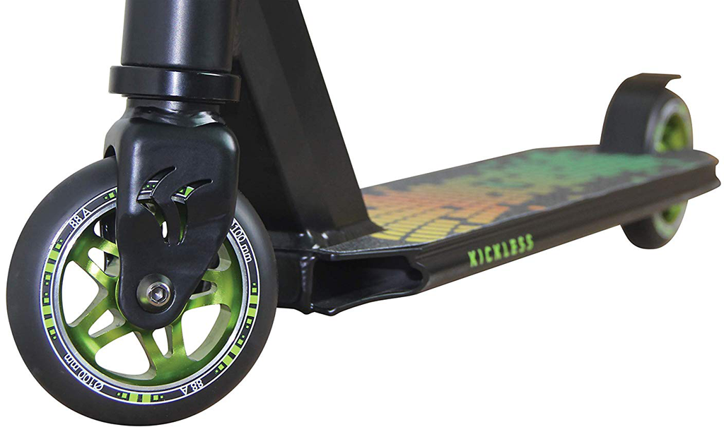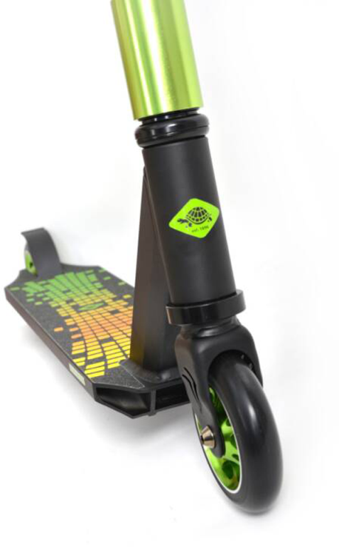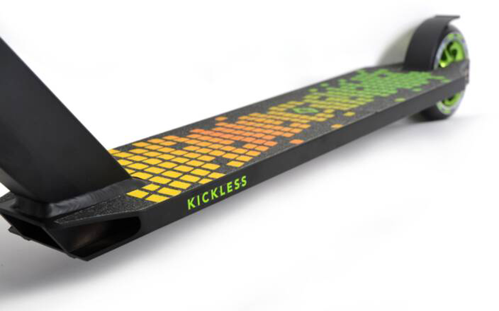 The new "Kickless" stunt scooter from funsport impresses with its high quality equipment at a fair price. Best material, great technology and top quality. The Kickless is for the ambitious rider and equiped to handle all tricks and stunts. Due to the deck of hardened high-quality 6061-aluminum in premium triple box construction, the scooter is very torsion-resistant and robust. The graphic griptapemakes the deck non-slip and provides a very stable and secure stand for all tricks. The deck is slightly bevelled on the underside to improve the grind edges. The 54 cm wide and 84 cm high, reinforced Y-handlebar is made of premium aluminum.The fork is made of shatterproof steel for maximum stability. The fork also has optically very sophisticated CNC milling.The steering tube and fork are connected with a quadruple clamp with four Allen screws. The high-quality and comfortable TPR handles always ensure a secure grip and good shock absorption. Installed is a premium HIC Compression Headset (Hidden Internal Compression -high-quality jib-free connection between handlebar and deck). Of course, the handlebar is 360 degrees rotatable for all tricks and stunts. The Kicklessis factory-equipped with 100 mm wheels made of non-slip PU (hardness 88A), these wheels are mounted on anodized aluminum rims, which can easily take away even larger bumps and jumps. Premium ABEC 9 bearings make the kickless perfect. The Kickless comes pre-assembled in a box.