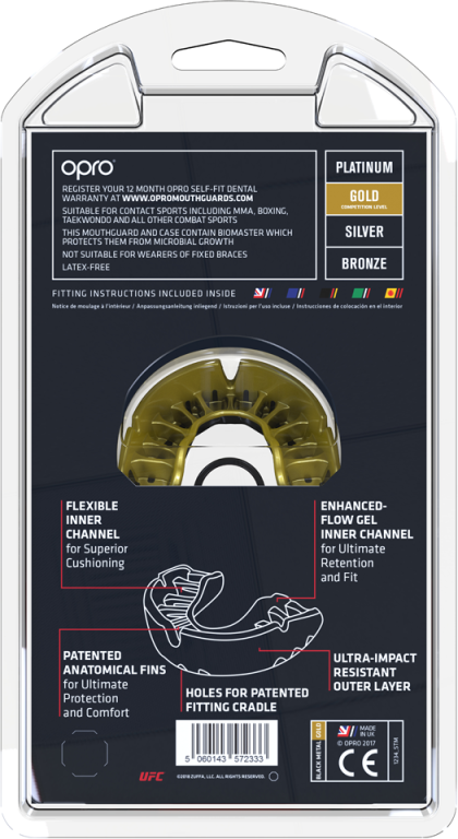 Opro Gold series is an elite level mouthguard in the OPRO Self-Fit range. It harnesses an inter-jaw absorption layer thanks to its two layer construction. This provides additional shock absorption between the upper and lower jaw. The OPRO Gold comes with an anti-microbial case, which means you can store your mouthguard safe in the knowledge that it’s protected against up to 99.99% of bacteria growth. Your Gold Mouthguard has 13 anatomical fins made from ultra flow gel that have been placed in exact positions to mould to your teeth snuggly. When the mouth guard is dropped into hot water the fins soften so it compresses them against your teeth and gums to create a mouth guard unique to you with high mouth retention characteristics. The three flex grooves help adapt to the mouth shape during the moulding process to help insure the best possible fit. Like the Platinum Mouthguard the Gold series comes with holes at the front and on either side where the cradle sits upon fitting. This ensures that you have a minimum amount of ultra-impact resistant material, which provides air cushions for added protection against blows or shots to the teeth and gums. Each Gold mouthguard comes with our very own fitting cradle that not only makes the fitting process swift and easy, but also means you have a minimum thickness left after moulding. This is key to protecting your teeth.