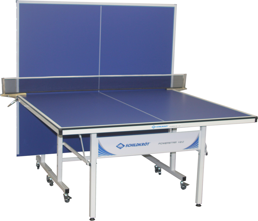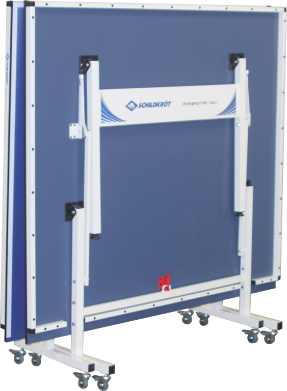 Powerstar V2 features a 15mm mdf playing surface for improved bounce. The two piece construction makes it compact to store or set for playback. Set up time is quick and easy only need the wheels to be bolted on after opening. Strong frame with added large front cross brace make the table very stable during play. The Table must be stored in a dry moisture free environment. Exposure the moisture will cause premature ware to the Table.