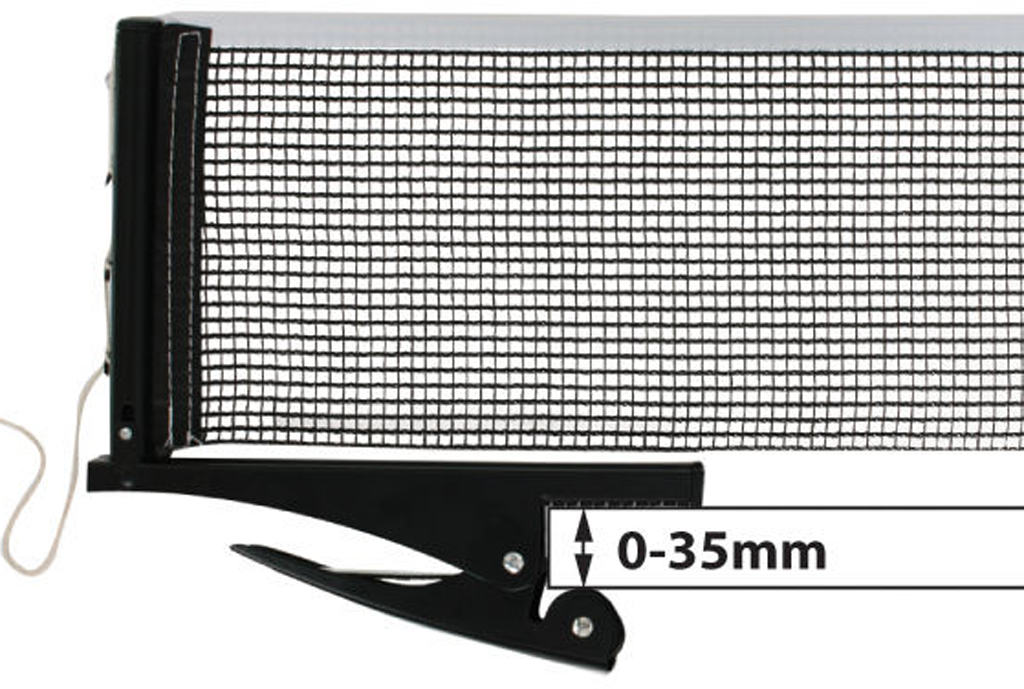 Schildkrot Team clip on net and post set is designed for recreational use. Features rubber mounting pads, High quality mesh net with pvc top, Simple net tension adjuster. Spring loaded clip on design. Suitable for tables with a mounting thickness of 10mm to 35mm