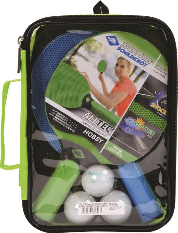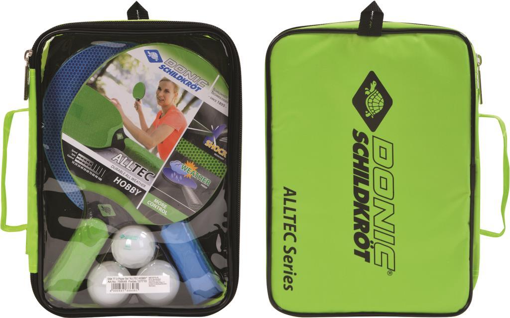 Schildkrot Alltec hobby bat set is designed for commercial use. The Alltec Hobby bat contains no wood and can be subject to moisture. The moulded design prevents breakages and the textured surface supplies adequate spin and power. The set is supplied with 2 bats and 3 Elite one star balls.