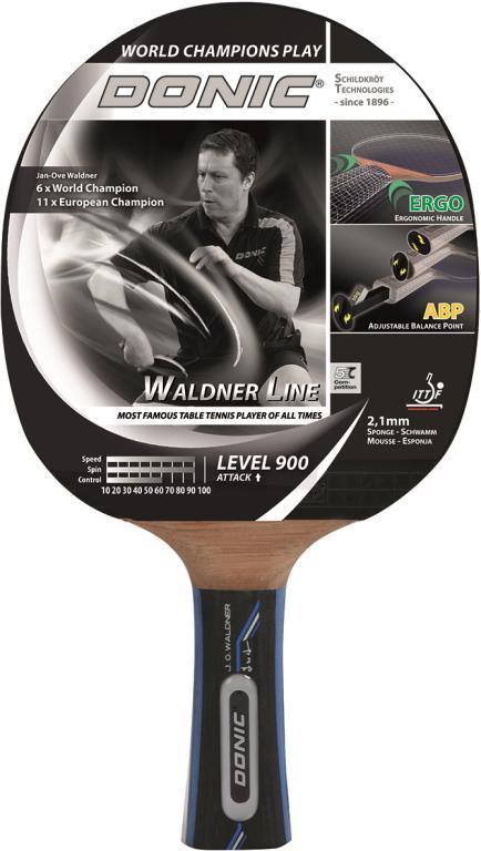 Donic Waldner 900 is a competition quality bat. Waldner 900 is a ITTF approved bat and features, 5C Carbon insert blade, 2.1mm competition sponge, Alpha slick rubbers, Concave handle with ERGO design and ABP adjustable balance point.