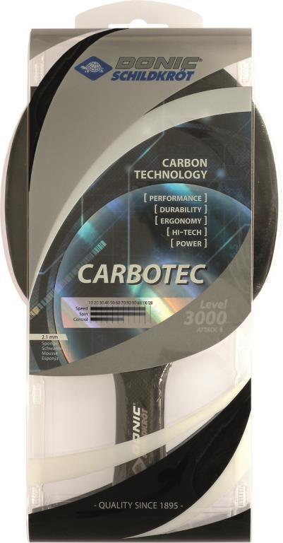Schildkrot Carbotec 3000 is a competition quality bat. Carbotec 3000 features, Patented 75% pressure moulded hi modulus Carbon blade, 2.1mm competition sponge and Energy rubbers. The pressure moulded carbon Blade provides perfect ergonomics and balance.